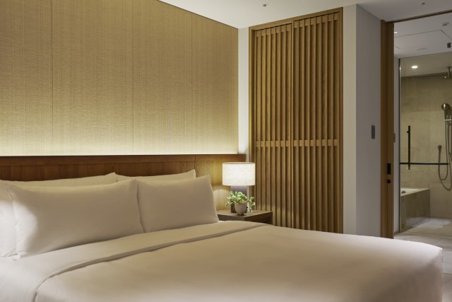 A picture window frames the cityscape and surrounding greenery, with views extending as far as Mount Fuji on clear mornings. This spacious studio, featuring a king-size bed, offers a functional layout filled with a sense of openness and ease.